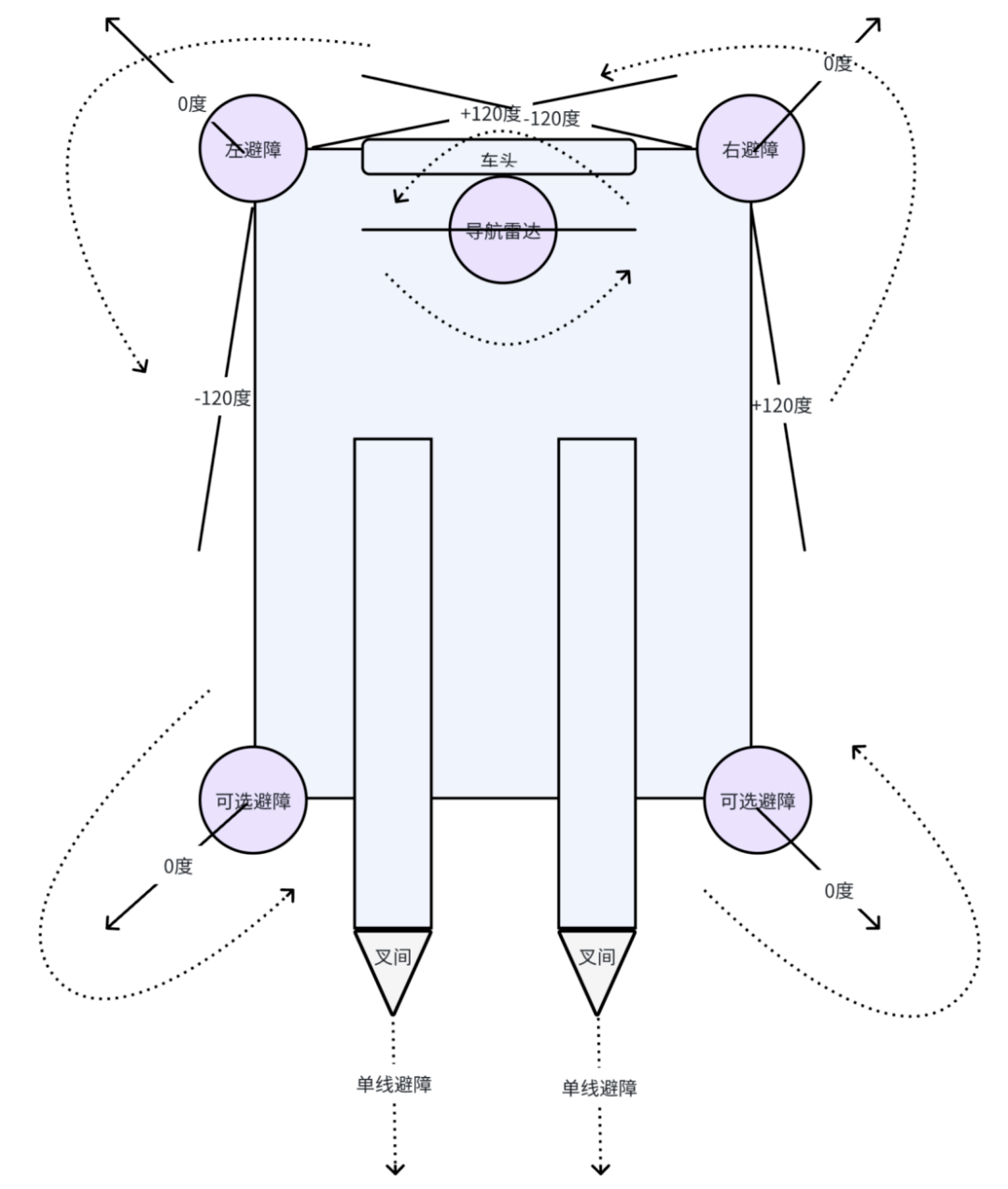 以雷达正前方为0度,覆盖车身边缘的范围为正负135度,但由于车体干涉,需要将靠近车体的部分滤除,因此FOV范围一般设定为正负120度。叉间一般只检测单线无角度避障。